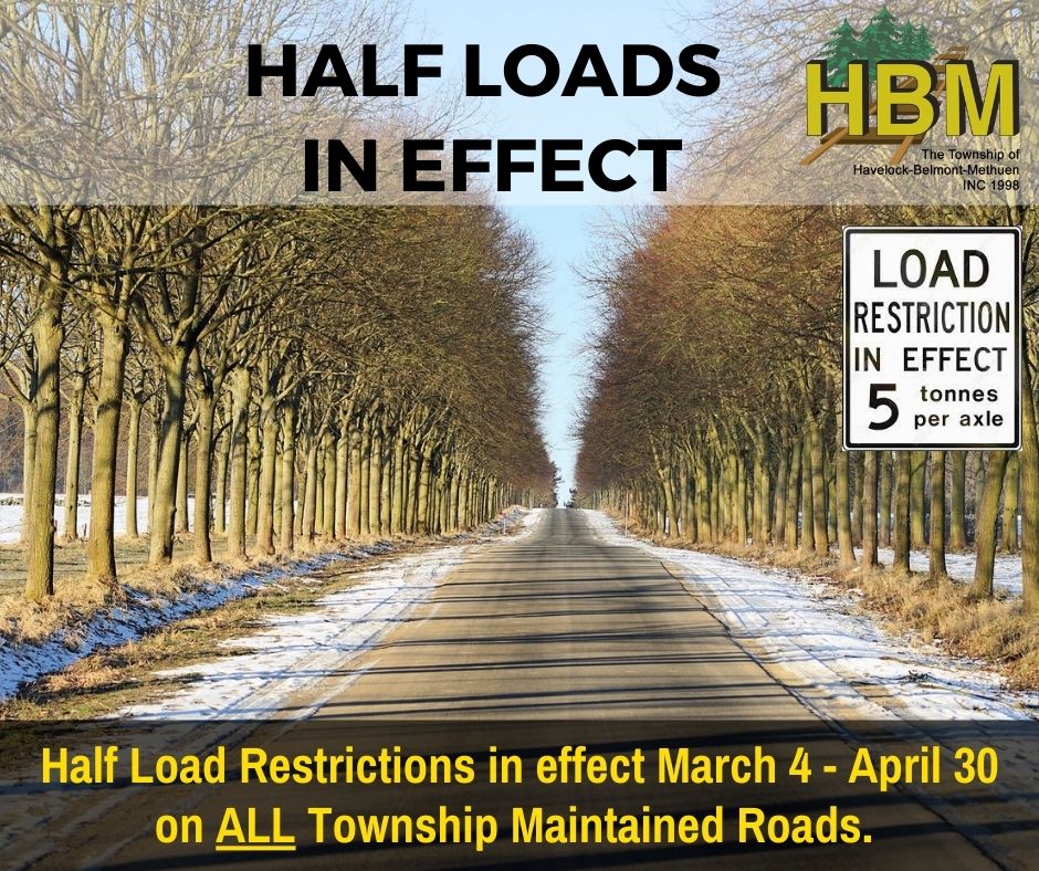 Half load restrictions for HBM Township go into effect Wednesday March 4, 2026, and will continue until Thursday April 30, 2026. The restrictions apply to all HBM Township maintained roads.