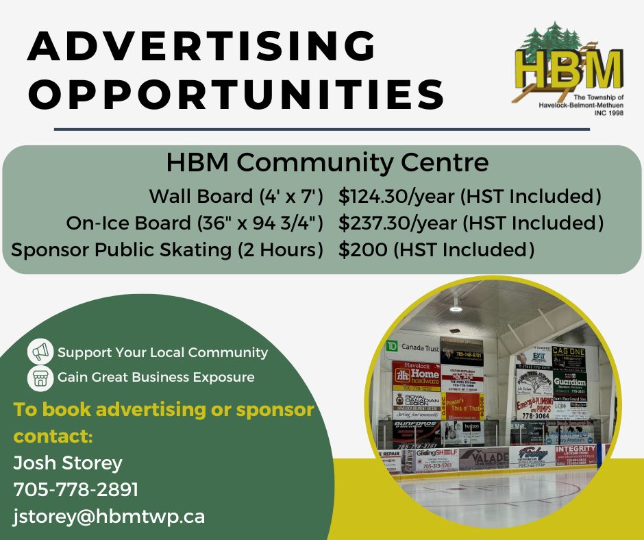 Support your local community and gain great business exposure by advertising in the HBM Community Centre on an Wall Board, On-Ice Board, or sponsor a Public Skating.