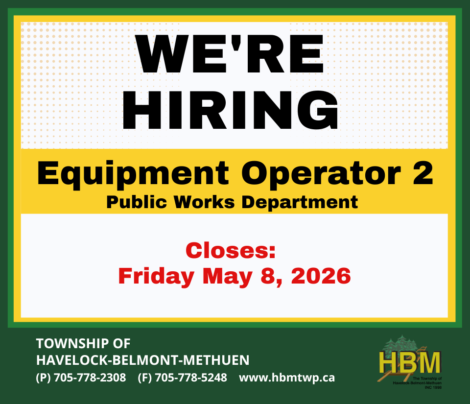 The Township of Havelock-Belmont-Methuen welcomes and encourages applications from people with disabilities. Accommodations are available on request for candidates taking part in all aspects of the selection process. Personal information is collected pursuant to the Municipal Freedom of Information and Protection of Privacy Act and will be used only to evaluate the suitability of applicants for employment.