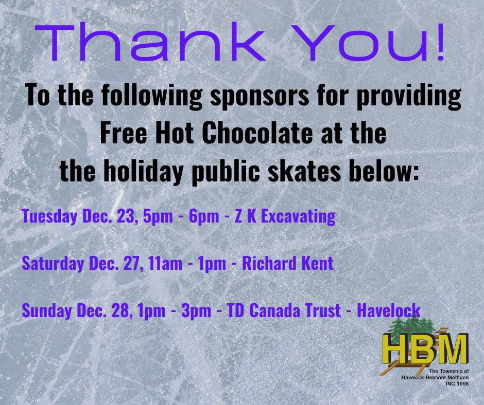 Thank you to the following sponsors for providing Free Hot Chocolate at the holiday public skates below: