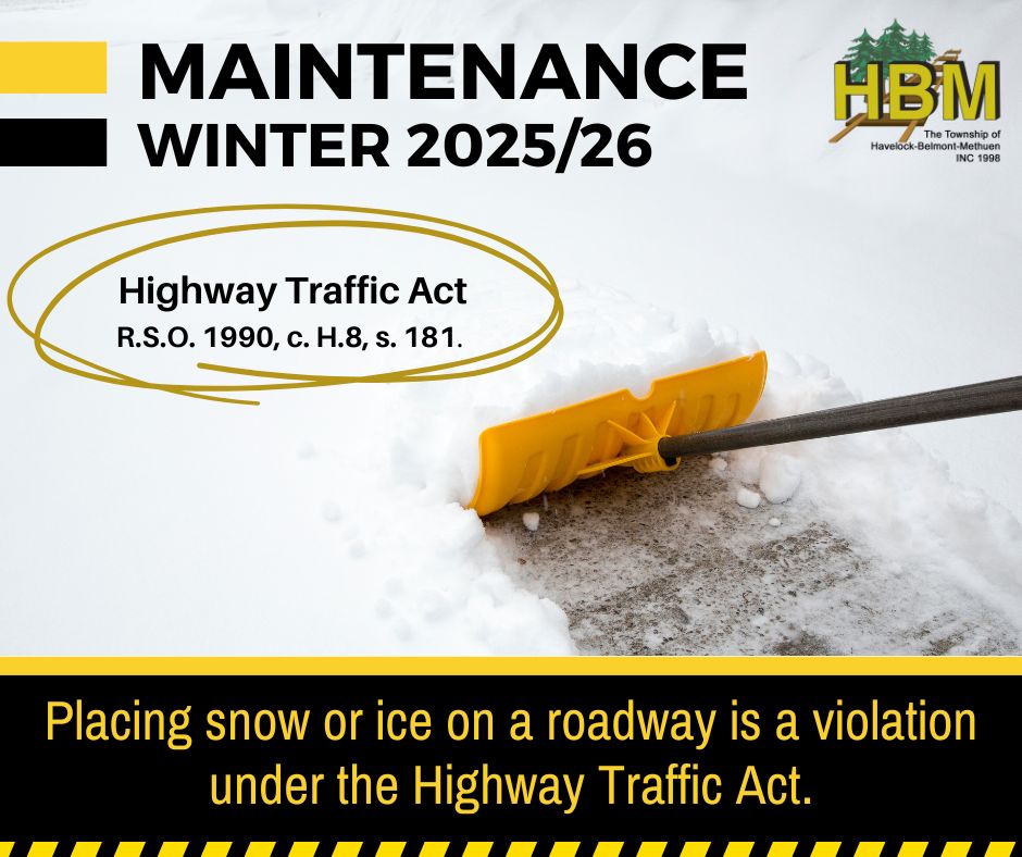 It is a violation of the Highway Traffic Act to place snow or ice on the roadway. R.S.O. 1990, c. H.8, s. 181.