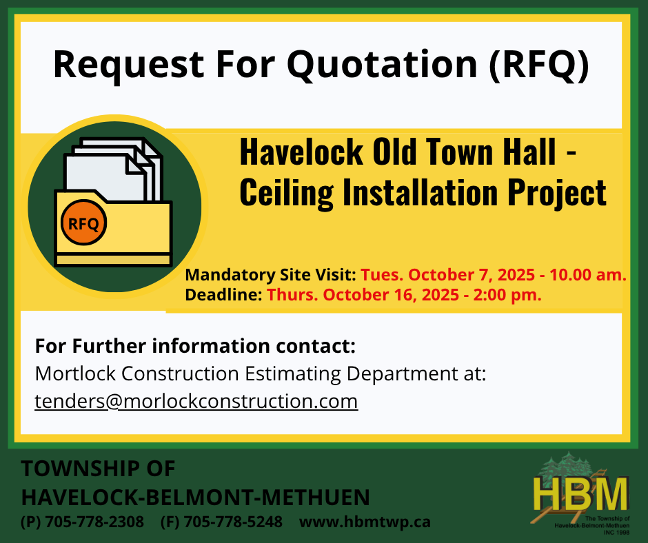 Please be aware, Mortlock Construction has issued a Request for Quotation – Havelock Old Town Hall – Ceiling Installation Project.