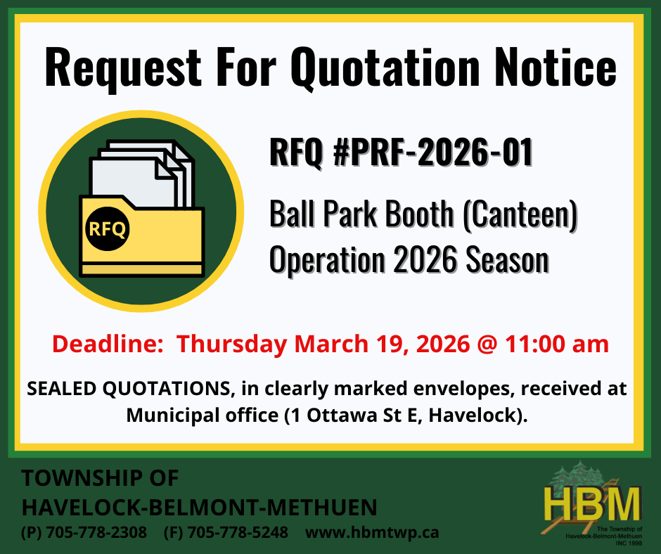 The Municipality’s quotation form must be completed and a hard copy submitted to the HBM Municipal Office, 1 Ottawa St. E., Havelock, Ontario. Alternatively, printed forms are available at the Township office.