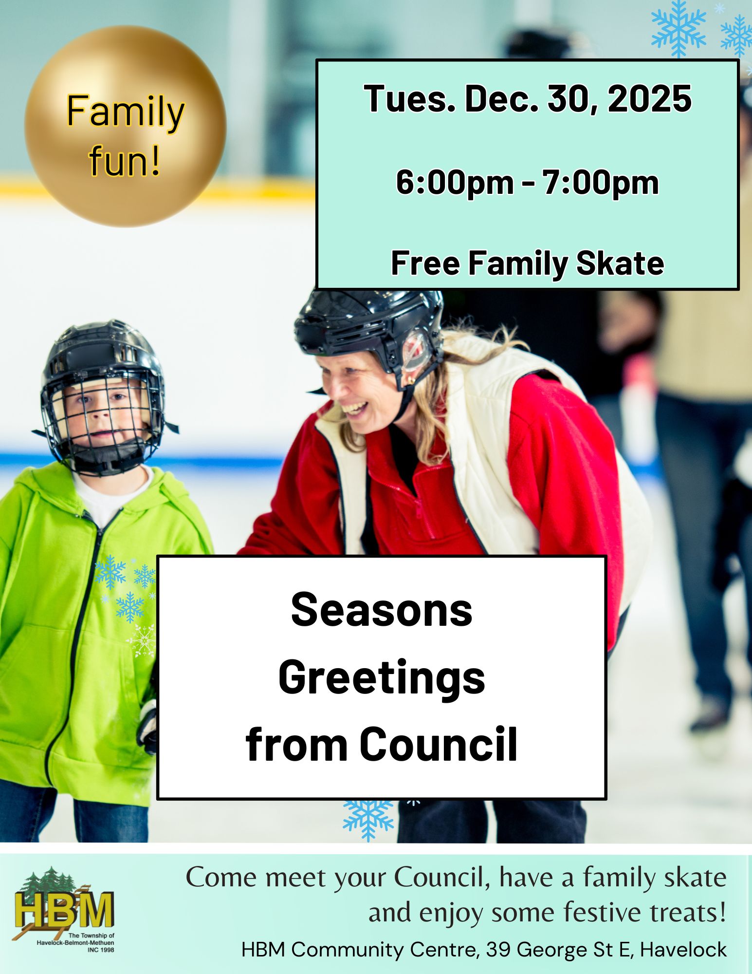 Please come and join HBM Members of Council on Tuesday December 30, 2025, from 6:00pm to 7:00pm for a free family skate.