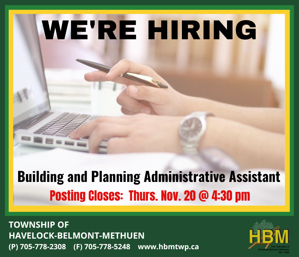 The Township of Havelock-Belmont-Methuen (H-B-M) is currently seeking a full-time, permanent Building and Planning Administrative Assistant. Reporting to the Chief Building Official, the Administrative Assistant to the Building, Planning and By-Law Departments is responsible for assisting with building and planning department activities, ensuring compliance with provisions of the Ontario Building Code, the Building Code Act, and all other relevant legislation and regulations.