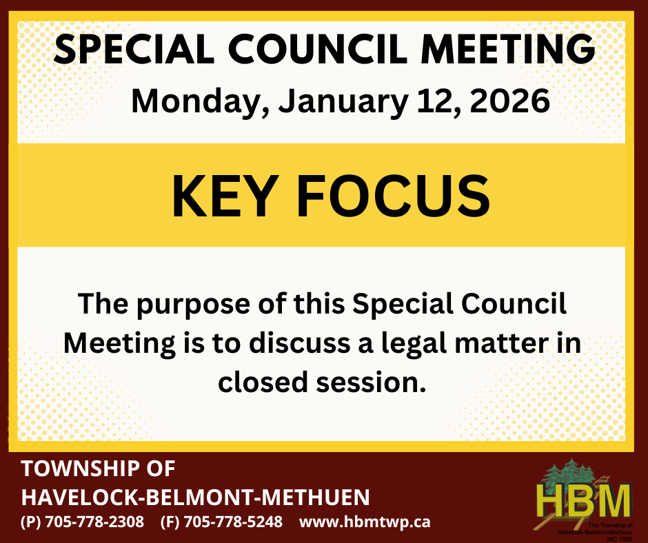 Take notice that the Council of the Township of Havelock-Belmont-Methuen will hold a Special Council Meeting (closed session) on Monday, January 12, 2026.